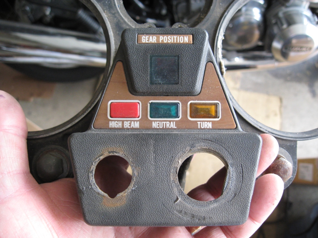 The indicator lamps for the signal, high beam and neutral were moved from the tachometer to a new pilot lamp case which also added an LED gear indicator to show which gear you were in (below left). For the 1974 through 1976 models a red high beam warning light was used with a green gear indicator lens, and the LED indicator was red. The indicator surround plate appears brown due to UV bleaching, but was originally black. At the same time, the left drive chain cover had the gear change pattern added to the casting as seen to the lower right.