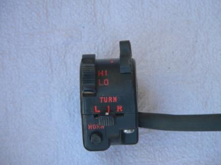 The left side switch gear was similar to that used in 1973 as in 1973 the turn signal switch actuator has a half round head, and is secured from the underside to the switch plate by a screw. The markings on the switch gear are changed from 1973 in that the arrows showing left and right for the turn signals now had the word 'TURN' marked beside them. As well 'HORN' was spelled out and the 'H' and 'L' high low dipping switch for the headlamp now was marked as being 'Lights'. The part number was 57700-31602.