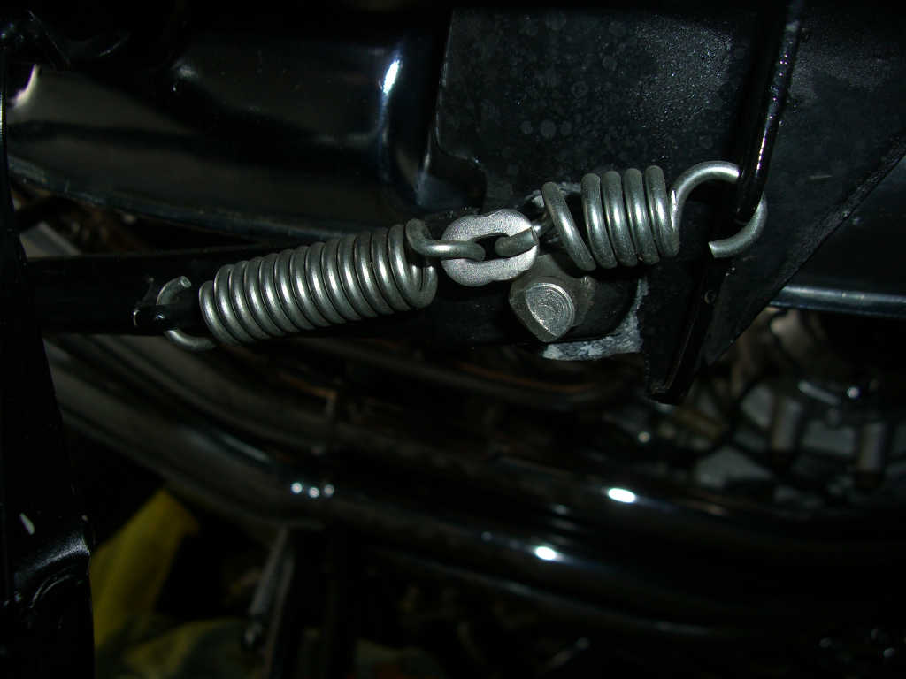 As far as I know, the Swiss/Austrian model B GT750 was the only one to include a self retracting prop stand. To the right is a photo sent to me by Mick Taylor looking up at the underside of the prop stand mounting plate with the left side frame rail to the bottom of the photo. In this you can see the special spring (42421-31000) and special bolt (09119-10014) used for this.