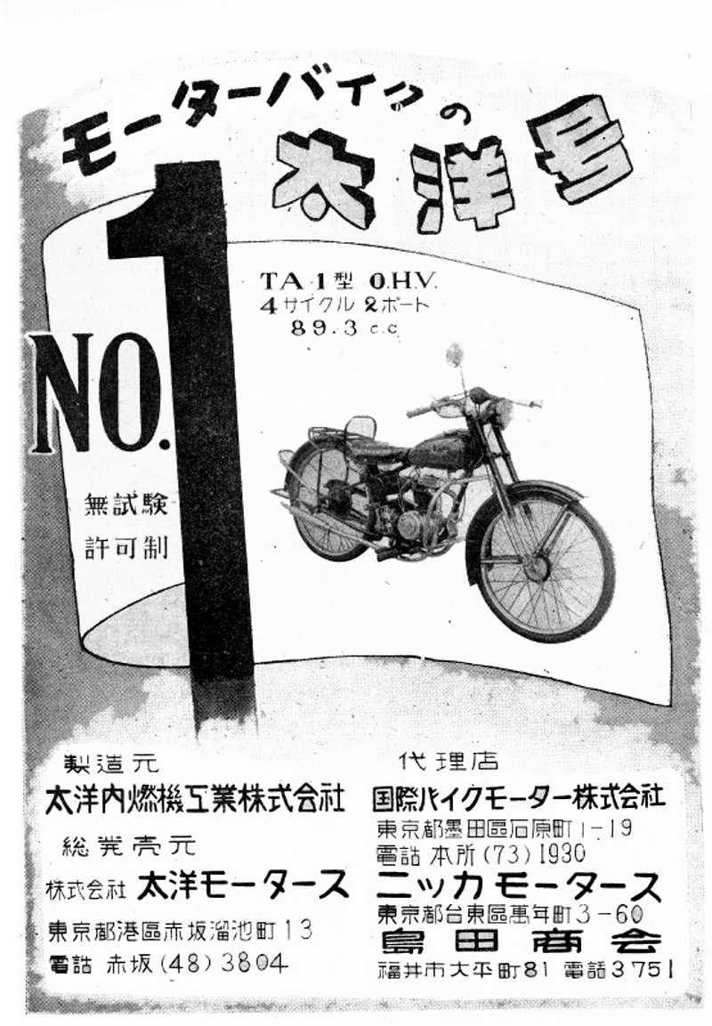 Not a lot of information about this company, but Taiyo Motors made a line of bikes under the Taiyo (タイヨー号) brand. The book 'Century of Japanese Motorcycles' lists them only for 1953, but they did at least announce a 1954 line-up with with the TA-1 in 1953 and the TA-S in 1954. Both were 90cc, single cylinder ohv 4 strokes.