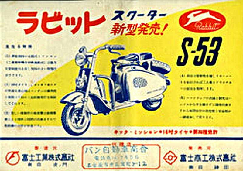At the end of WWII, the Nakajima Aircraft Company reformed as New Fuji Industries in 1945, and then Fuji Heavy Industries in 1953. In June of 1946 they produced the 'Rabbit' scooter which was largely based on an American Powell scooter. The 'Rabbit' was quite successful with over 500,000 sold and remained in production till 1968 when it was removed from the market to allow a manufacturing transition to full Subaru production which had started in 1958. Eventually the name was changed to Subaru Co. Ltd in 2017.