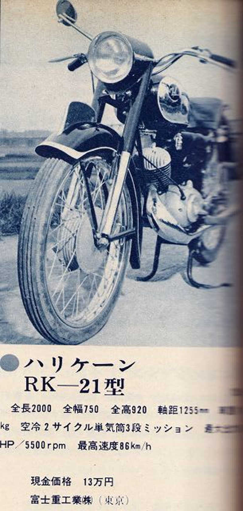 Fuji Heavy Industries also produced British styled motorcycles initially called the King Dyna (キングダイナ) in 1954, changing to the Hurricane (ハリケーン) in 1956 (?). These were produced at their Omiya facility outside of Tokyo. Production supposedly ran from 1951 to 1961 and included 250cc (model T92C ?), 348cc ohv single cylinder 4 stroke versions, as well as a 2 stroke version called the RK-21.