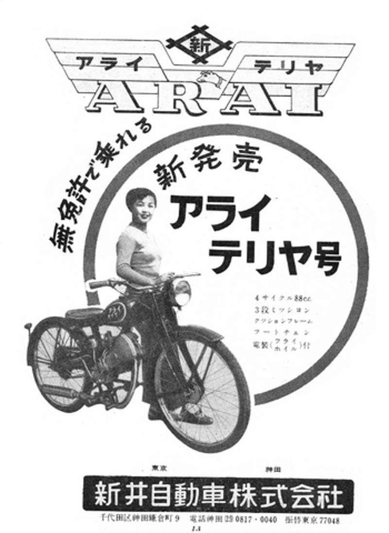 An assembler, rather than a manufacturer, Arai used engines made by Mizuho Automobile Manufacturing Co.. The 1953 Teriya (テリヤ号) was an 88cc moped, and the 1954 Shinei (進栄号) was a 250cc OHV four stroke motorcycle. Arai was in business from 1953 through till early 1955, and production ceased when Mizuho brought out their own line of machines in 1955.