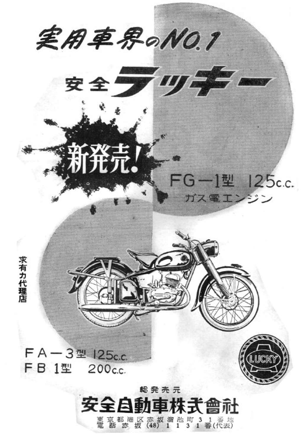 山王自動車工業 Previously known as Yamato Shokai Co. Ltd. (ヤマト商会), the company evidently started out as a repair company servicing Honda's. In 1953 they started production of the 'Lucky' line of motorcycles, which were offered in 125cc (the FA and the FG) and 200cc variants (FB). All were 2 stroke machines, and the FG version appears to have been a plunger rear suspension They ceased trading in 1958.