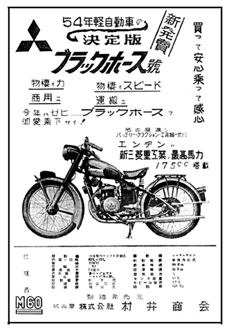 No information on this company, other than the 1954 model appears to have used a Mitsubishi engine. Murai Shokai was perhaps in business between 1954 and 1956. The model they produced was called the 'Black Horse' ( ブラックホース号) which was of 175cc displacement.